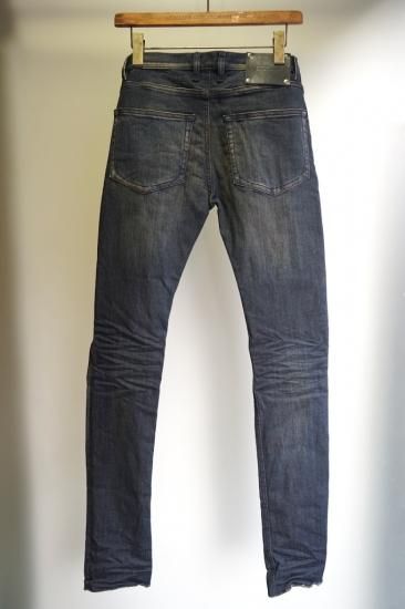 "ISKO"は1904年に生まれ現在では世界30ヵ国に支社を構えるトルコのデニム生地屋。スーパーストレッチデニムとして世界各国のハイブランドに素材を提供しています。スーパーストレッチ性の秘密としては、PBT(ポリブチレンテレフタート)という化学繊維を使用しキックバックは勿論、度重なる屈折後も跡が残らずといった形状記憶性が特性となります。昨今一般的にストレッチデニムが使用されていますが、PBTを最も初めに世界に広げたのが"ISKO"と言われています。メイドインイタリーで一環生産を行う事でしっかりとしたクオリティを保持しつつ、コストパフォーマンス性も実現しました。素材感も加えて、一度お試し頂きたい一本に仕上がっています。ウエストから膝にかけて程好く余裕を持たせ、膝下からタイトに仕上げたスーパースキニーシルエット。タイトなシルエットですが膝から上のラインに余裕を持たせることにより、比較的ラフな感覚で着用頂けます。待望のヴィンテージ加工を施した合わせやすいアイテムです。