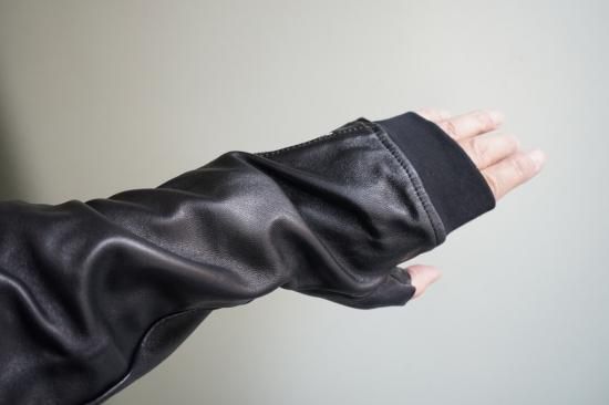 撥水加工を施したラムスキンを使用したロンググローブになります。指の第1関節から肘までを覆うデザインです。