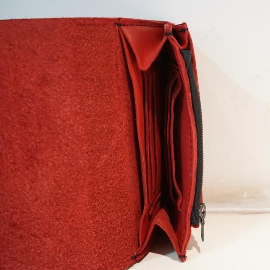国内のタンナーにより丁寧に仕上げられたダブルショルダーレザーを採用。製品染色を施工した皮革を用い、粗野な雰囲気を表現。製品基のカサっとした質感は使用に伴い油分が浮き上がり、驚くほどに滑らかな艶のある表情に変化します。デイリーユースのウォレットこそのダブルショルダーレザー特有の硬質な質感が柔軟に深化するエイジングを最も感じて頂きやすいプロダクション。小ぶりなサイズ感ながら札の他に、適度な枚数のカードやコインの収納も可能な機能性をスマートに纏め上げた二つ折りウォレット。