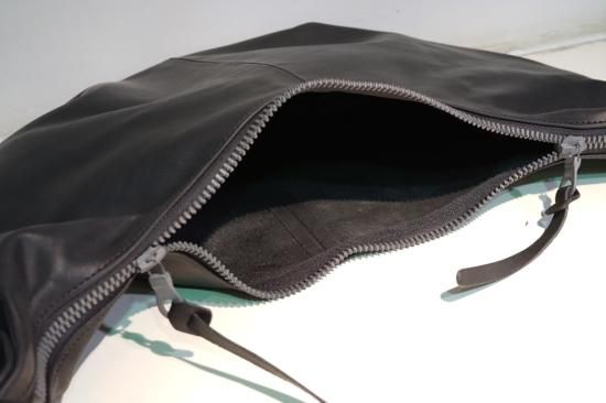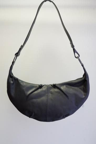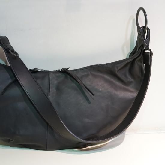 イタリアGUIDI社製オイルカーフレザーを使用。きめ細やかな艶みを持ち、オイルがたっぷりと含まれていることを感じることのできるしっとりとした手触りが魅力。柔軟な質感に反したしっかりとハリとコシのある皮革は、使用に伴ってアジのあるエイジングを期待頂けます。この皮革の醍醐味でもある裏面の綺麗な表情を活かし、裏地をは敢えて配備していません。バッグコレクションの中でも特にブランドを代表する通称"バナナバッグ"。デイリーユースするアイテムであるからこそ一層機能性を追求。湾曲した独自の造形による身体へのフィット感が絶妙です。ショルダーストラップを2段階で調節することが可能です。※こちらはミディアムサイズになります。