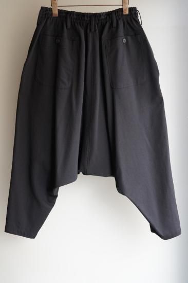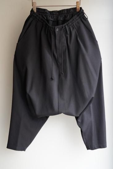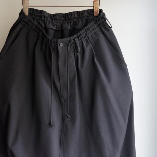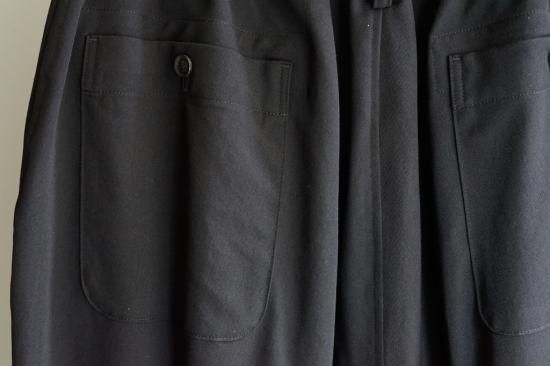 Yohji Yamamotoの代名詞ともいえる「ウールギャバジン」を使用しています。ウール仕上げの工程でセット性を弱くすることにより、織物にシワやシボをつけ、ウール本来の風合いを活かした生地です。今季はバックポケットはパッチポケットを配置。裾口はリブなしのすっきりとしたシルエット。生地特性のドレープ感をお楽しみ下さい。