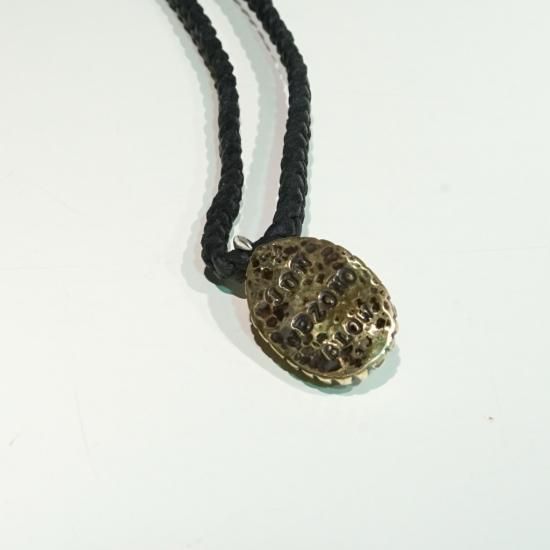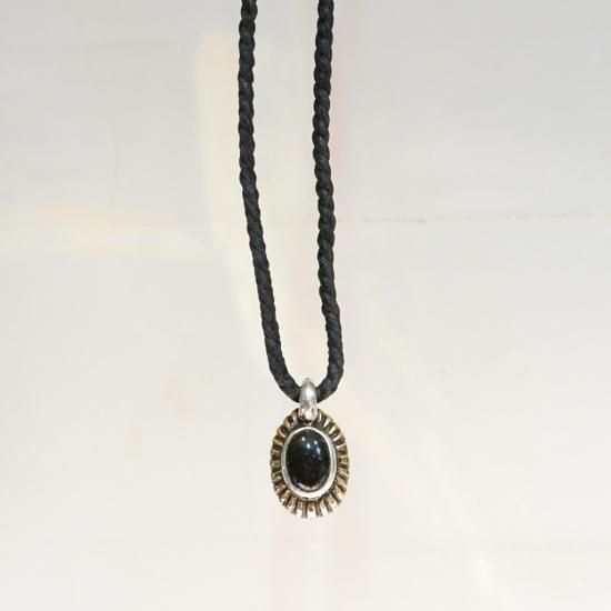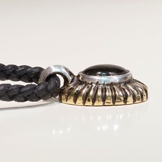 メキシカンをイメージしたブラス×シルバーのコンビネーションをベースにしたネックレス。水牛の角から削り出したバッファローホーンを中央に据えました。中心から広がる放射状の彫りをフェニックス彫りと名づけ、全ての型に使用しています。バッファローホーンは昔から強さや自由を導く縁起ものとして、日本ではお守りや刀の装飾にも使用されてきました。角の色味は黒めのものを選んでいますが、サンプルにも見られるよう白や茶色が混ざる部分もある為、量産では一点一点微妙に違いが出ます。また、使い込む程に適度に油分が染み込み、より角の素材感や光沢感が増し、経年変化も楽しめると思います。