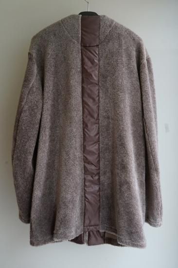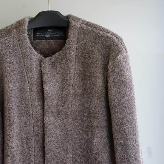 ソフトでぬくもりのあるポリエステルコットン混紡パイル生地です。すっきりとした丸首、両脇ポケットがついたジャケットカーディガンです。後ろ身頃にポリエステル地の縦ラインがポイントでシンプルでバジュラらしいひねりが魅力です。