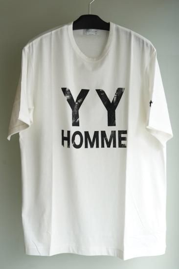 Yohji Yamamoto POUR HOMMEの頭文字、YY HOMMEの顔料プリントが施された半袖カットソー。2012SSの復刻ロゴデザインです。シリコン柔軟剤で風合い良く仕上げています。顔料プリントのため個体差が生じます。