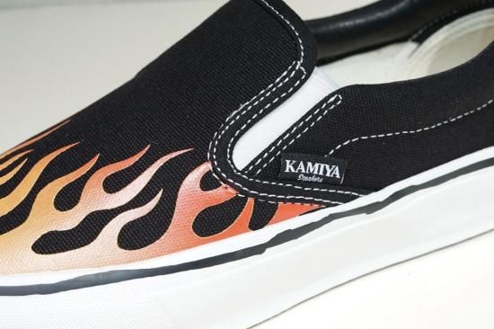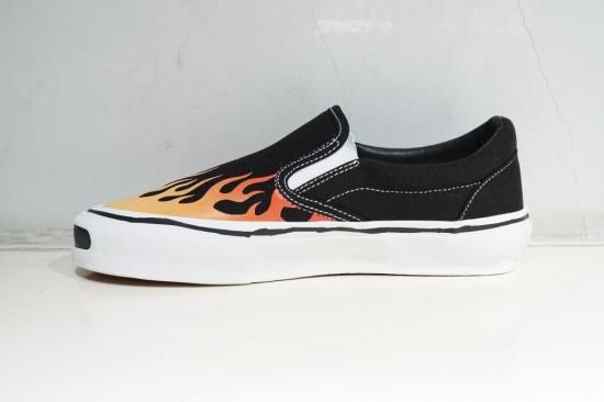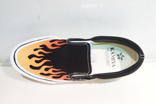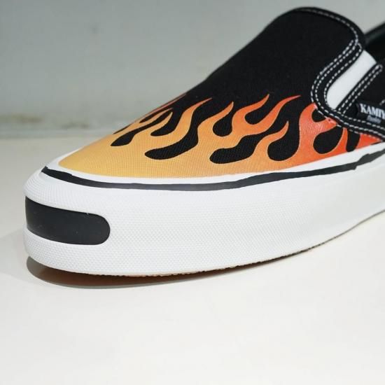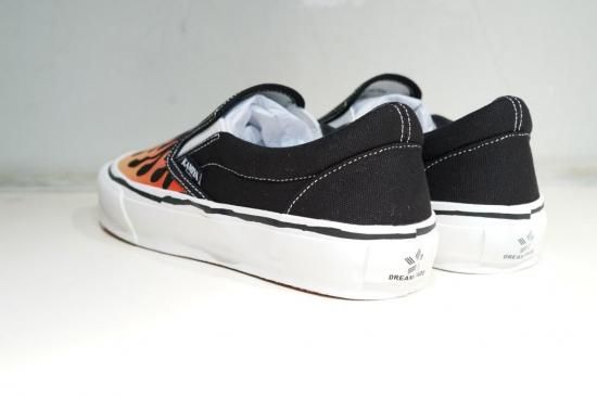 アイコニックな手書きのラインが象徴的なソール。ソールはヴァルカナイズ製法。アッパーにファイヤーパターンをプリント。着脱のしやすいスリップオンデザイン。ヒール部にピスネームと DREAM MADE(ドリームメイド)ロゴのヒールラベルをデザイン。
