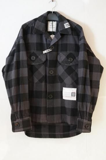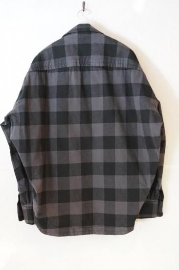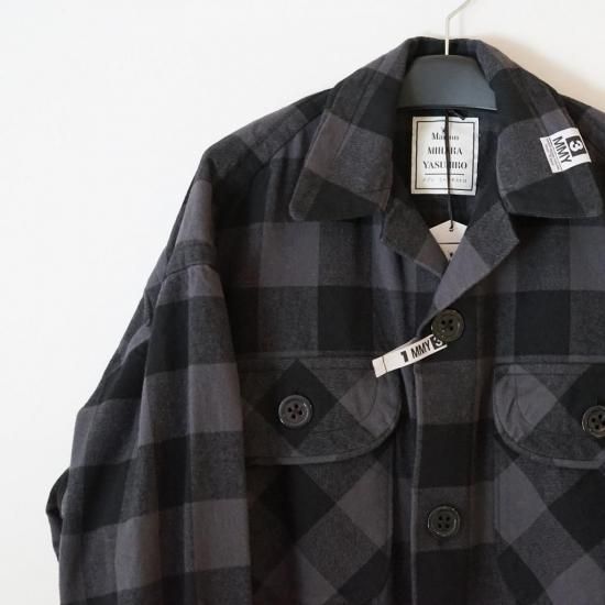 ドールシャツのディテールを拡大したデザインのブロックチェックシャツ。胸ポケット。ワイドシルエット。サイズアップしたボタン、タグをデザイン。後ろ丈が長いデザイン。オーバーサイズのコットンネルのシャツブルゾン的な雰囲気です。
