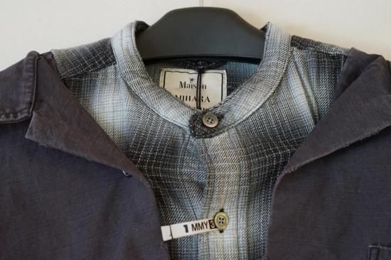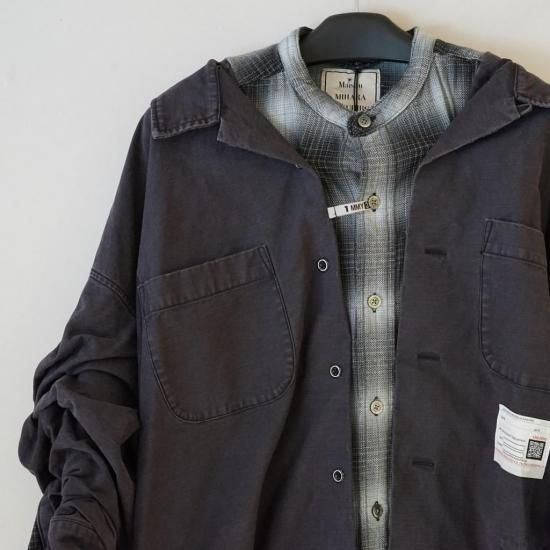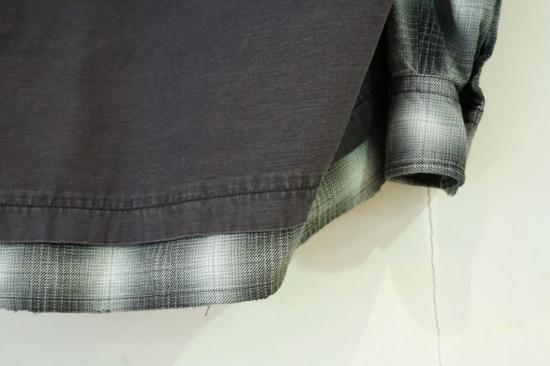 レイヤードロングスリーブシャツ。ノーカラーシャツの上にシャツ重ねたレイヤードデザイン。袖はまくったような立体的スタイル。胸ポケット。ボタンアップ。後ろ丈が長いデザイン。