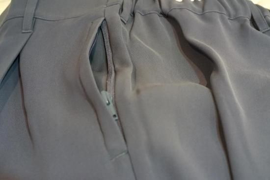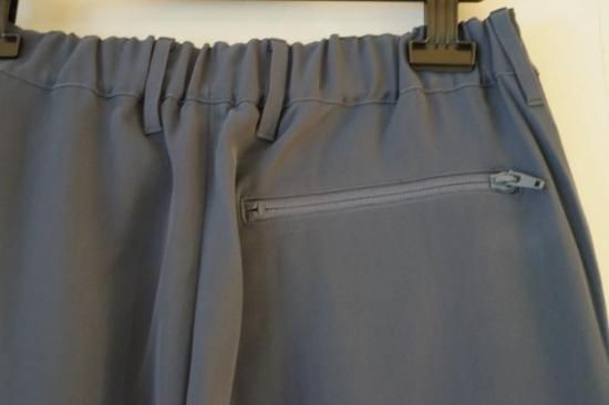 撥水加工された膨らみのあるソフトタッチ(ピーチスキン)のポリエステル。ワンタックで程よい太さで履き心地の良いシルエット、両脇、ピスポケットにファスナーを装備。後ろ帯はゴム仕様で動きが楽です。