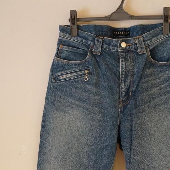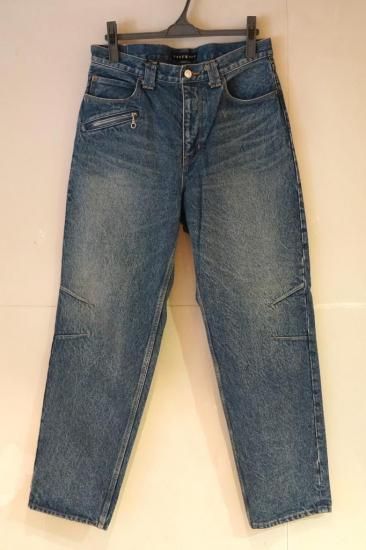 80年代の14オンスデニムをリプロダクト。スッキリとした表面感、ドライな風合い、加工によるシボ感の出やすさなど、当時の特徴を忠実に再現。太めのテーパードシルエット。ユーズド加工済。