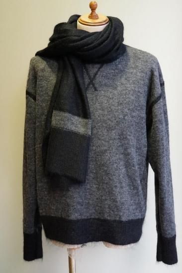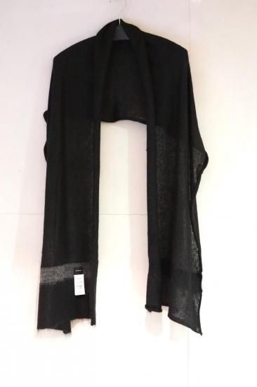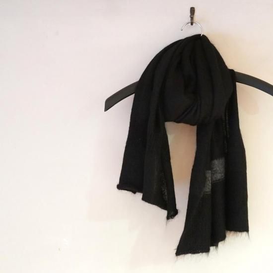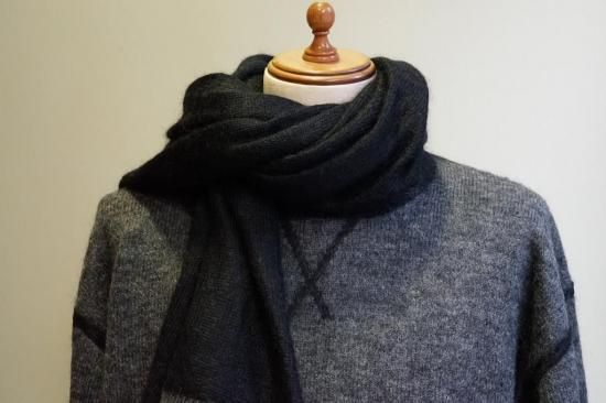ミリタリーブランケットをベースにしたストール。端やサイドの始末、ライン部分を色々な編み地のテクニックで表現している毛足の長い上品なキッドモヘアを使用。