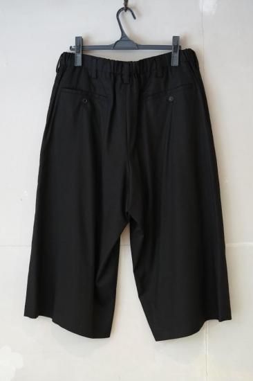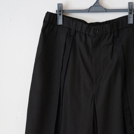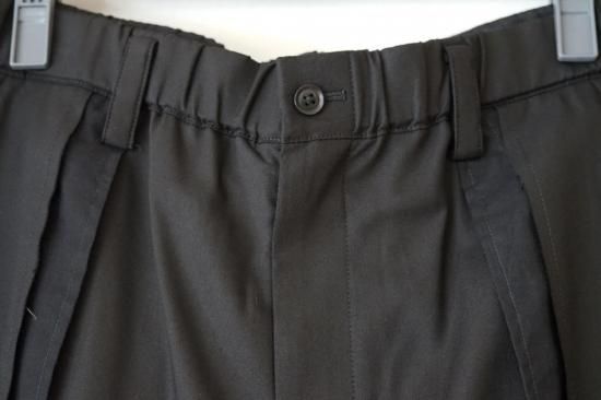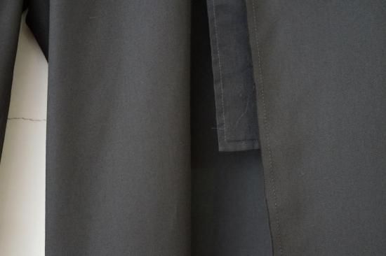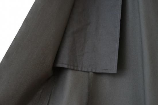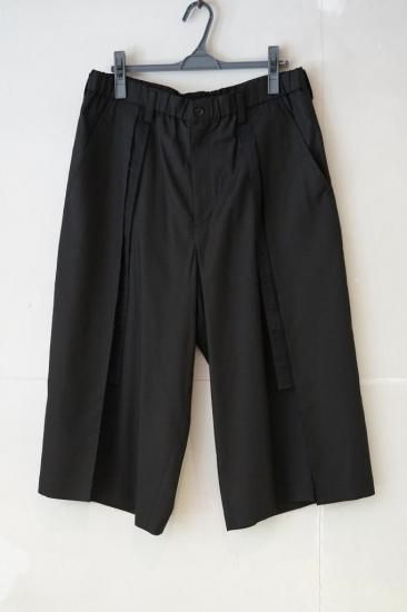 7分丈パンツ。膝下丈のストレートパンツ、前身頃は断ち切り生地が重なっており、間からポケットの袋布をあえて魅せるデザインとなっております。重なり部分も途中まではステッチで止まっていますが、ステッチの無い裾側はスリットの様になり動きが出ます。