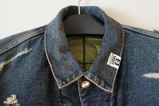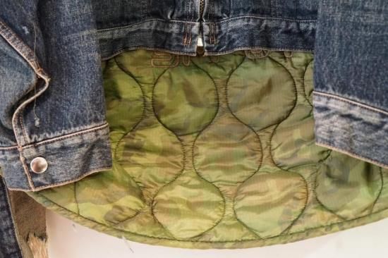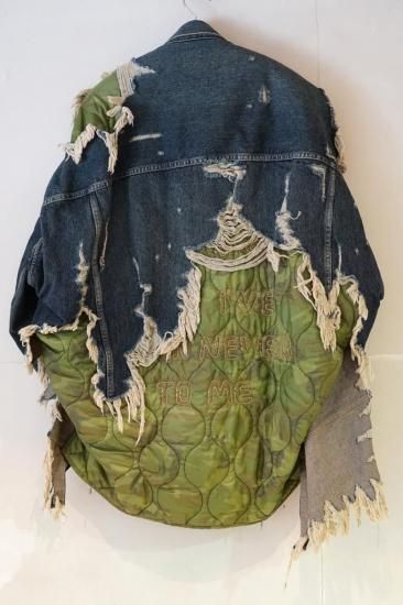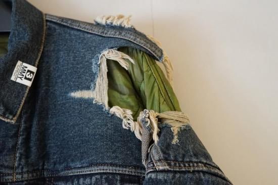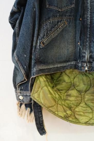 ミリタリージャケットの上にデニムジャケットがレイヤーされたデザイン。ショルダーとバックが大胆に破れたデザイン。ヴィンテージ加工が施されています。ジップアップ。フロント4つポケット。