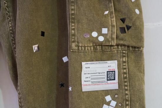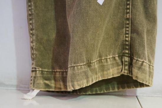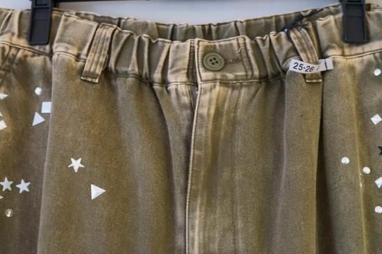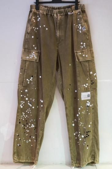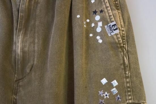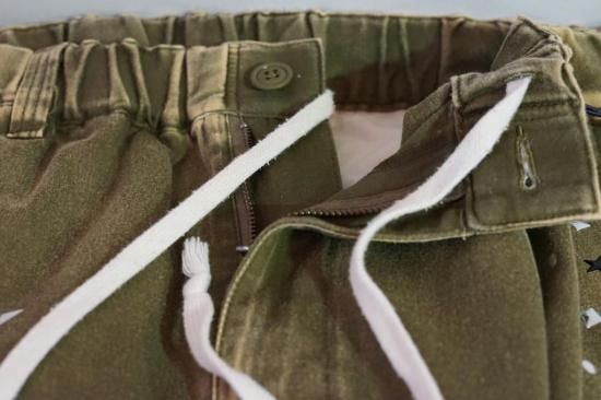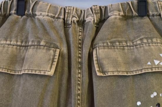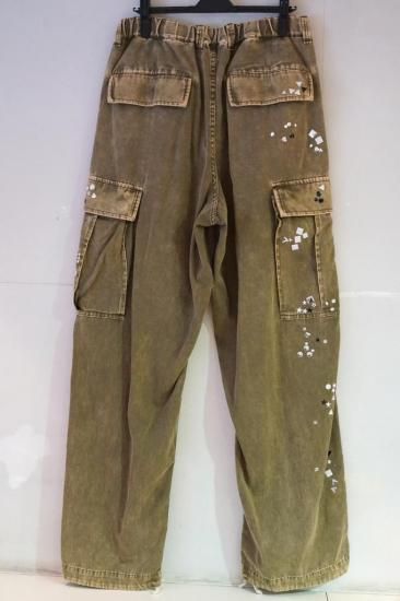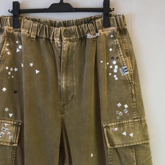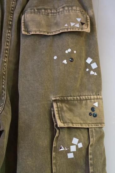 ラインストーンの装飾が施されたミリタリームパンツ。裾ドローストイング。コットンルーズサテン生地にヴィンテージライクな加工が施されています。ウエストゴム、ループ仕様。ウエスト紐を付属。サイド、バックポケット。