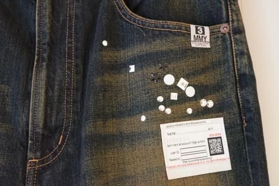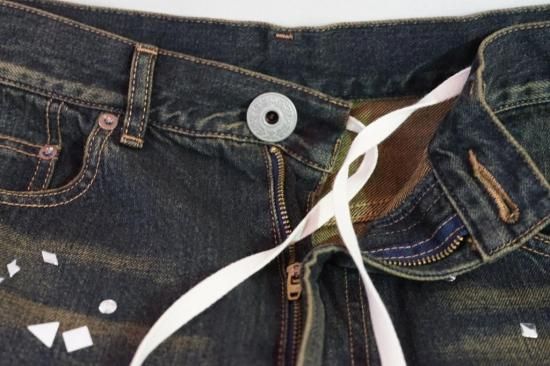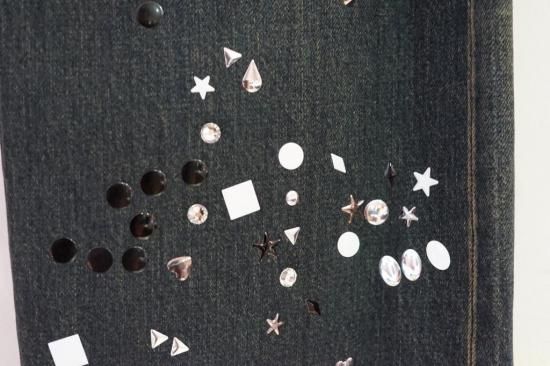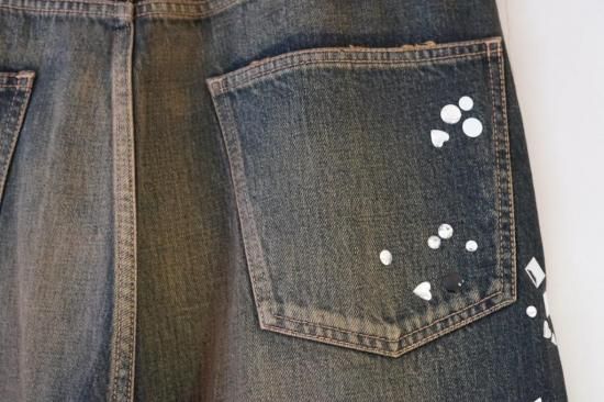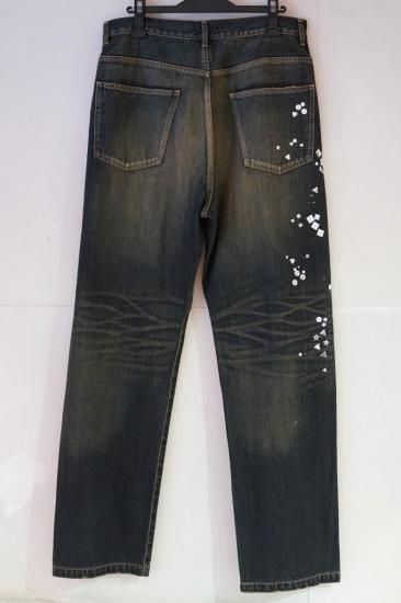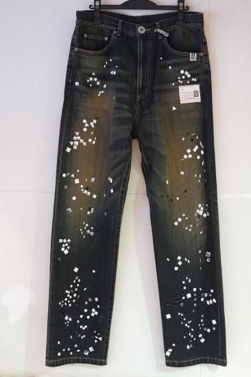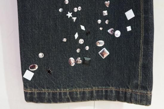 ラインストーンの装飾が施されたデニムパンツ。生地にヴィンテージライクな加工が施されています。ベルトループ仕様。ウエスト紐を付属。ベーシックな5ポケットジーンズ。