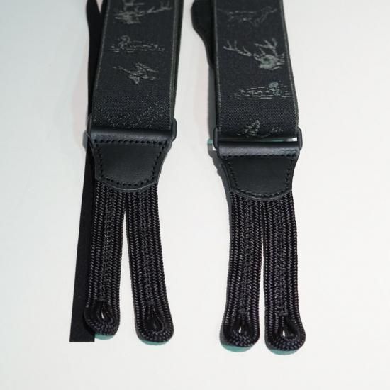 伸縮性のあるエラスティックを用いたサスペンダー。様々な動物が刺繍されています。ボタンループの為、ボタンが付いたパンツなら取り付ける事が可能です。
