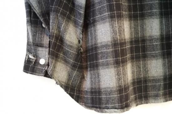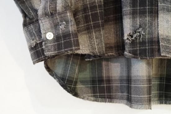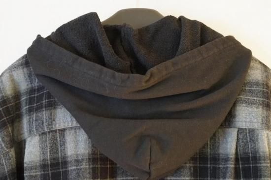 フードがコンバインドされたコットンフランネル生地のチェックシャツ。オーバーサイズなフィッティング。KAMIYAオリジナルボタンを使用。手作業で施したダメージ加工。汚し加工。