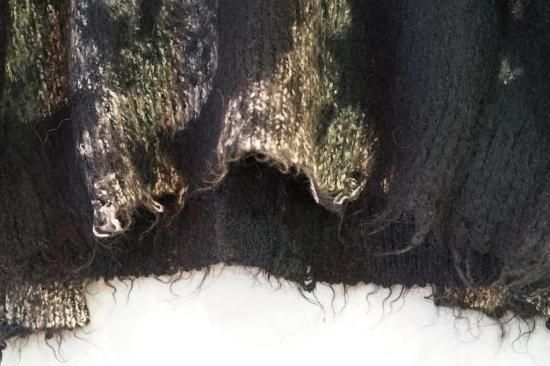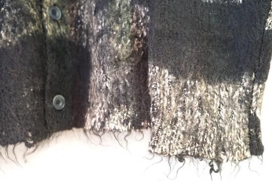 ミドルゲージのモヘヤ混ブラッシュドヤーンニット。コットンブークレヤーンを混紡して起毛させることで独特の柔らかい表面感を表現。泥で汚れたようなエイジング加工。ワイドフィット。ボタンアップ。