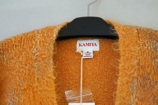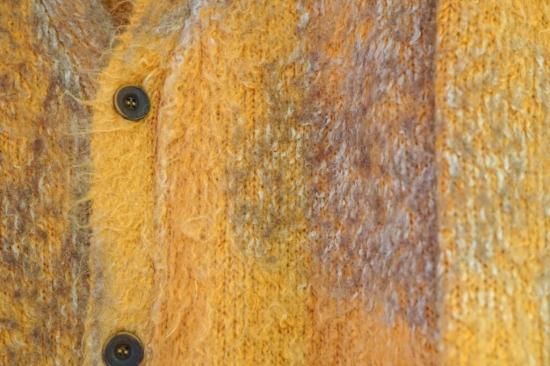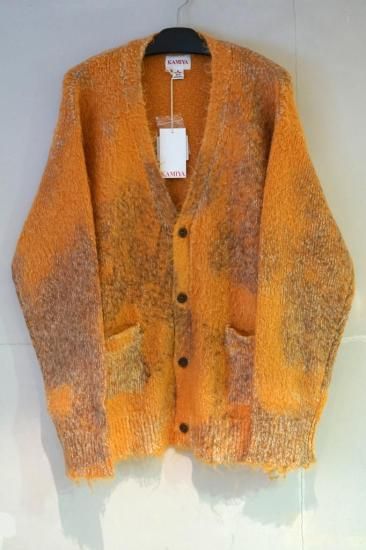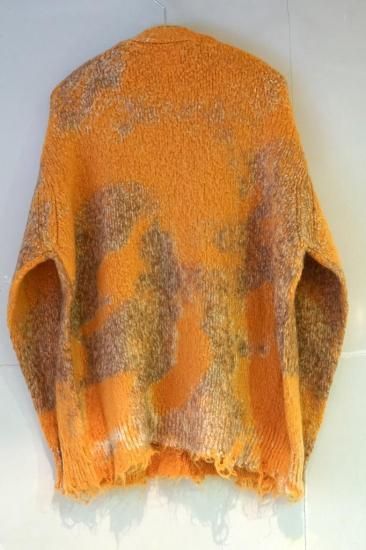 ミドルゲージのモヘヤ混ブラッシュドヤーンニット。コットンブークレヤーンを混紡して起毛させることで独特の柔らかい表面感を表現。泥で汚れたようなエイジング加工。ワイドフィット。ボタンアップ。