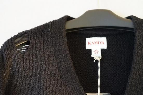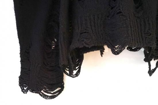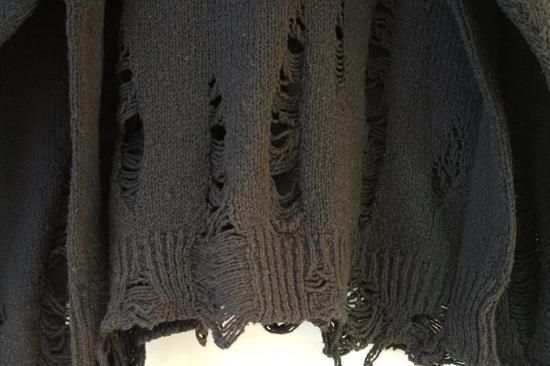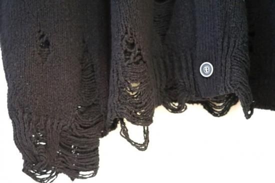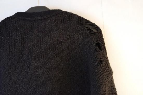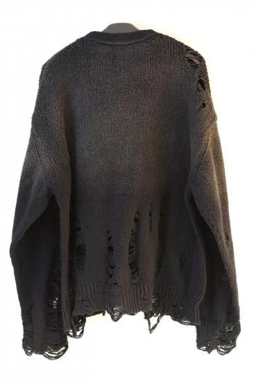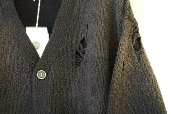 ミドルゲージのコットンスラブヤーンニット。ハードなダメージを針抜きで表現。長年着用したような日焼け風エイジング加工。ワイドフィット。ボタンアップ。