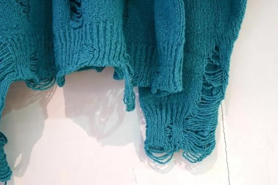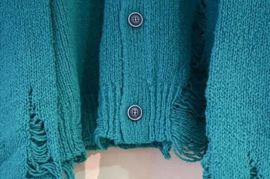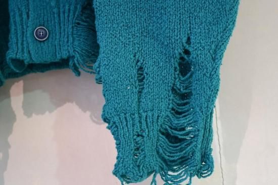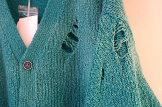 ミドルゲージのコットンスラブヤーンニット。ハードなダメージを針抜きで表現。長年着用したような日焼け風エイジング加工。ワイドフィット。ボタンアップ。