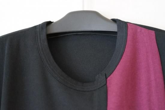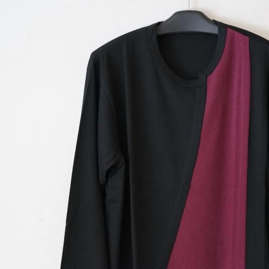 切り替え線が裁ち切り仕様の長袖Tシャツです。両生地ともに右前身頃のみ色が異なるデザインポイントがあります。