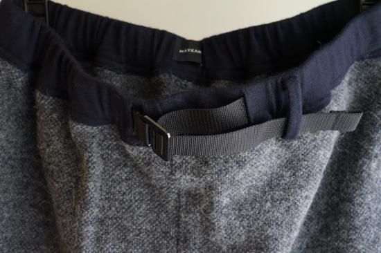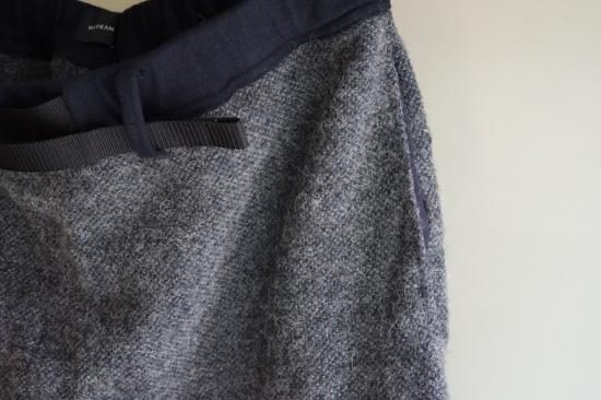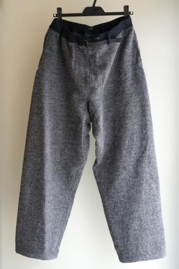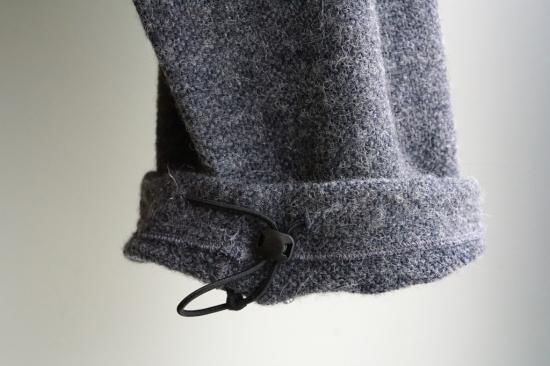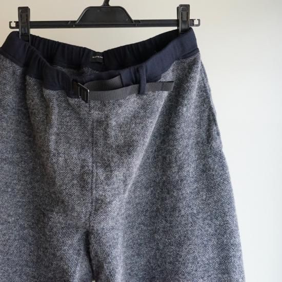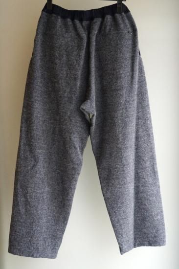 サイドシームレスのイージーパンツ。裾はドローコード仕様。後ろポケットはコンシールファスナーでミニマルに仕上げている。擬⿇コットンをベースにソフトで保温⼒のあるベビーアルパカ/ウールを組み合わせ、張りがありながら軽く独特なタッチの編み地を使⽤。