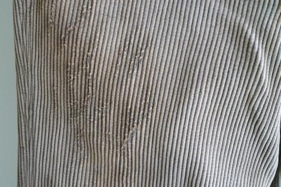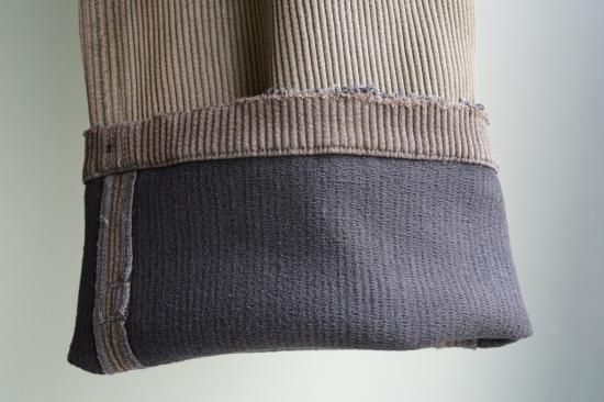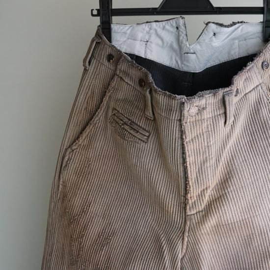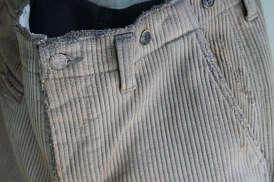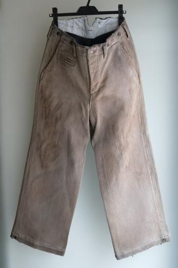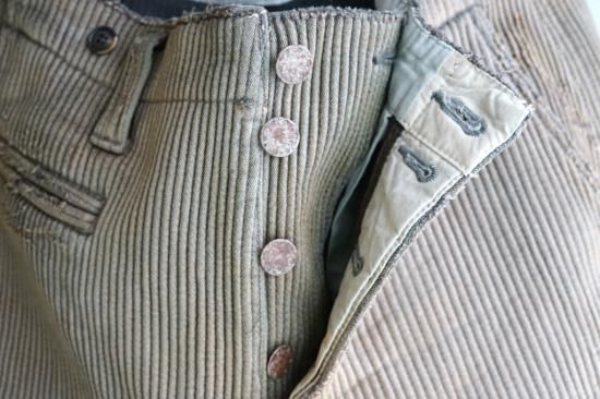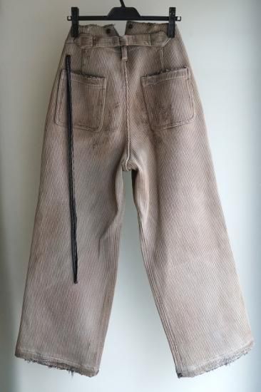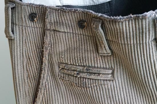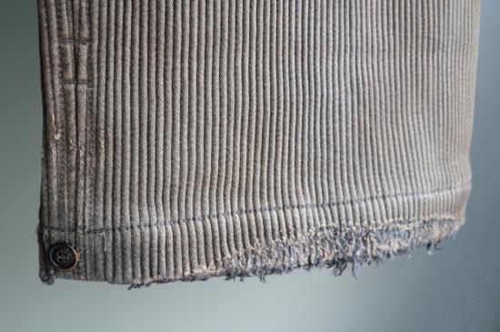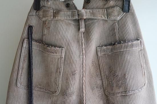 厚手のヘビーピケを用い、表面の色を落としグラインダーと染料でエイジングしリアルヴィンテージ感がある風合いに仕上げています。ピケは凹凸がある生地なので凹になっている部分はベース色が残っています。シルエットは全体的にゆったりとしたバギー。後上部にはシンチバック、裾にはボタンが2列配備されており、折り返して留めることでレングスの長さを調整可能。サスペンダー用の水牛釦を配置しています。