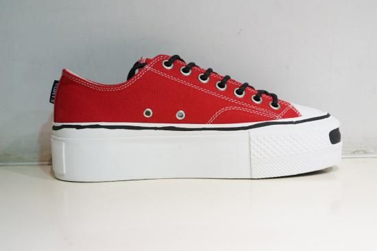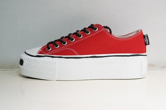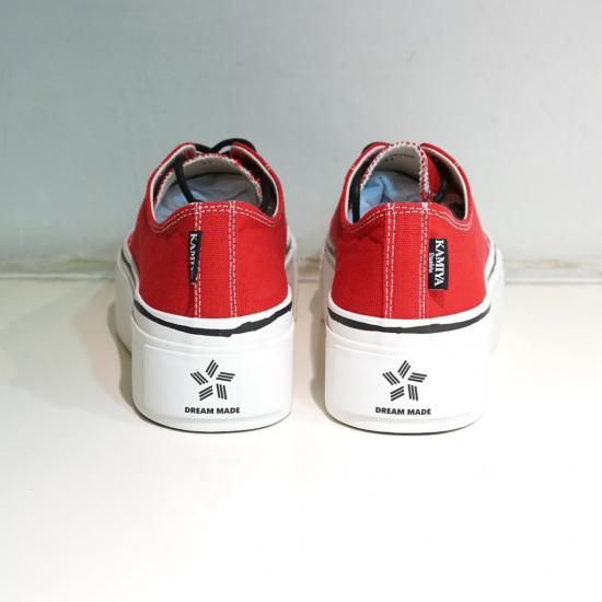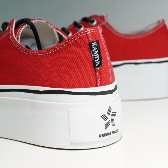 トゥキャップのクラシカルなディテールが特徴的な、5アイレットのモデルHerc(ハーク)定番スニーカーを厚底ソールでアップデートしたデザイン。ヒール部にDREAM MADE(ドリームメイド)ロゴのヒールラベルをデザイン。まるでマジックペンで線を描いたようなサイドラインは、デザイナー神谷がサインプル試作時に実際に描いたものをプリントしたオリジナリティ溢れるデザイン。5.3cmの厚底仕様。