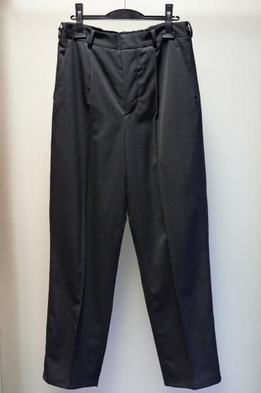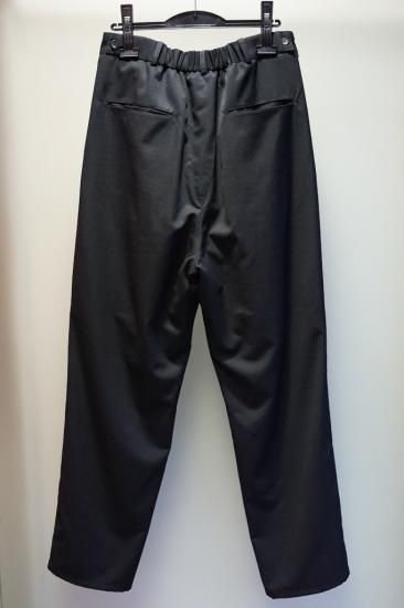 股上は深くゆったりとした履き心地で、直線的に走るタックステッチが美脚効果をもたらします。ミニマルなスリットポケットやプリミティブな存在感の水牛ボタンがディテールに加わり、素材の力強いブラックとほどよい光沢感による、上品な表情をよりひきたてます。このパンツは、刀の緊張感と素材の風合い、履き心地のリラックス感を兼ね備え、日本の美意識を西洋のパンツに融合させたデザインです。
